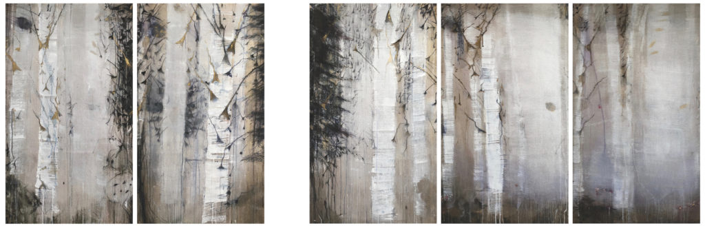 Waldweg - Jeder ist allein, 120x300, Diptychon/Triptychon, Mischtechnik auf Leinwand, 2019